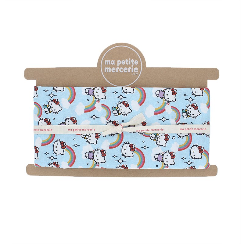 Un coupon tissu de 50 cm, qui vous permettra d'imaginer des accessoires, patchworks ou vêtements pour enfants, tout en réduisant vos chutes de tissus ! Craquez pour ce très joli tissu coton cretonne Kitty la tête dans les nuages, souple et léger et ses motifs arcs-en-ciel et Hello Kitty sur un fond bleu ciel.