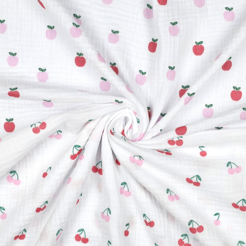 Craquez pour ce tissu double gaze de coton Cerisette et apportez une touche fruitée à vos basiques. Sa texture naturellement gaufrée et sa légèreté sont idéales pour confectionner des blouses aériennes, des robes d’été ou des ensembles confortables pour enfants. On adore son imprimé de cerises rouges et roses.