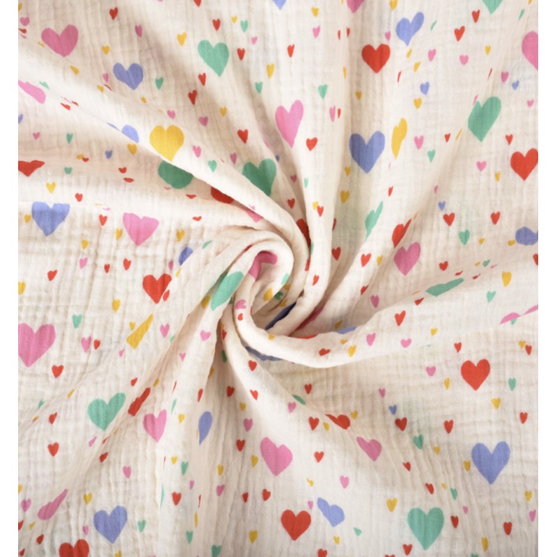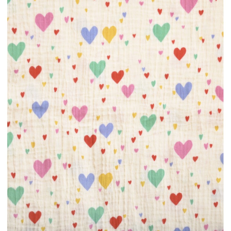 Découvrez ce tissu double gaze de coton Tiamo avec son motif de cœurs colorés sur un fond écru. Ce tissu à l'aspect légèrement gaufré et doux vous permettra de confectionner des vêtements et accessoires pour adultes, enfants et bébés.