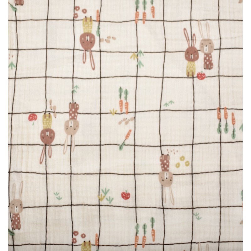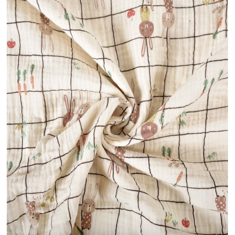 Découvrez ce tissu double gaze de coton Ilyes avec son motif de lapins trop mignons et carottes sur un fond écru à carreaux. Ce tissu à l'aspect légèrement gaufré et doux vous permettra de confectionner des vêtements et accessoires pour adultes, enfants et bébés.