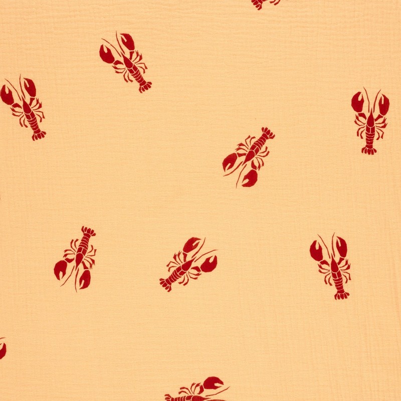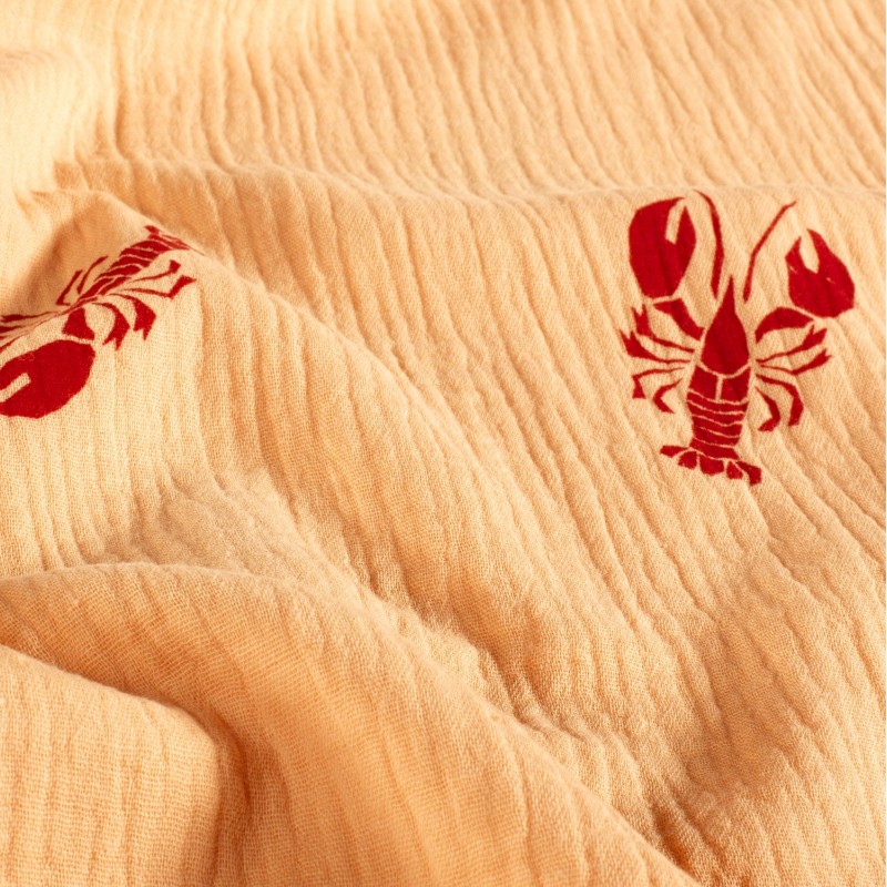Découvrez ce tissu double gaze de coton Homard avec son motif de homard sur un fond orange. Ce tissu à l'aspect légèrement gaufré et doux vous permettra de confectionner des vêtements et accessoires pour enfants et bébés.
