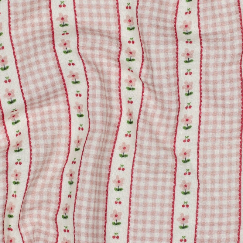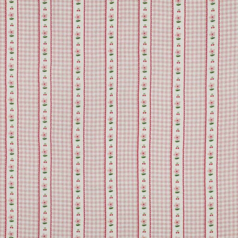 Découvrez ce tissu double gaze de coton Suzette avec son aspect légèrement gaufré et doux. Ornée de fines rayures fleuries et d'un quadrillage vichy, elle est parfaite pour coudre des blouses vaporeuses, des robes ou des accessoires pour enfants et bébés.