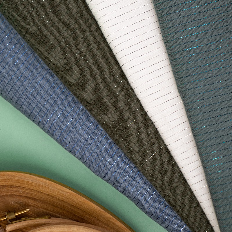 Vous avez aimé la double gaze à pois dorés? Vous allez adorer cette nouvelle double gaze de coton à fines rayures en lurex doré ! Ce tissu légèrement froissé ne nécessite pas de repassage, si vous souhaitez le repasser, faites-le sur l’envers du tissu.