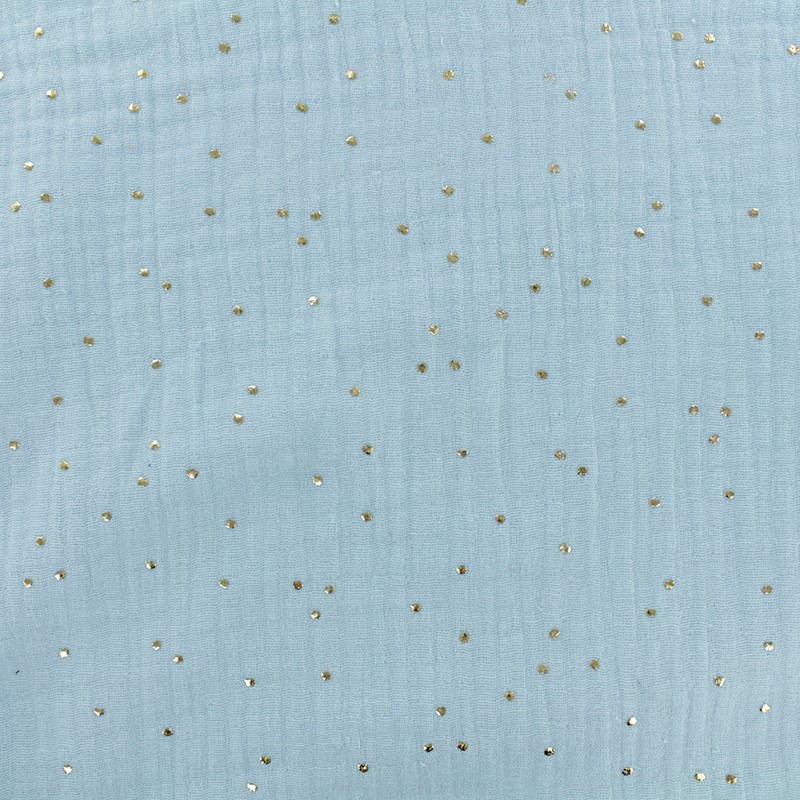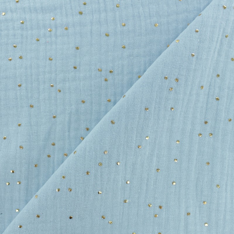 Ce tissu double gaze de coton bleu glacier à pois dorés est d'une extrême douceur. Elle sera parfaite pour faire des vêtements tels que des blouses ou pour confectionner la mythique petite robe noire.