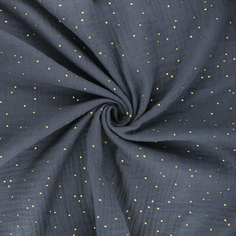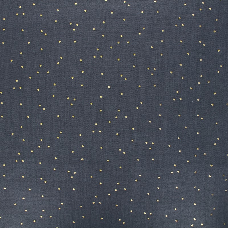 Ce tissu double gaze de coton gris à pois dorés est d'une extrême douceur. Elle sera parfaite pour faire des vêtements tels que des blouses ou pour confectionner la mythique petite robe noire.
