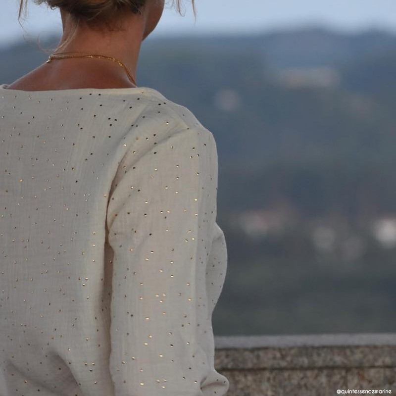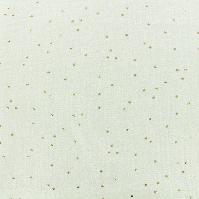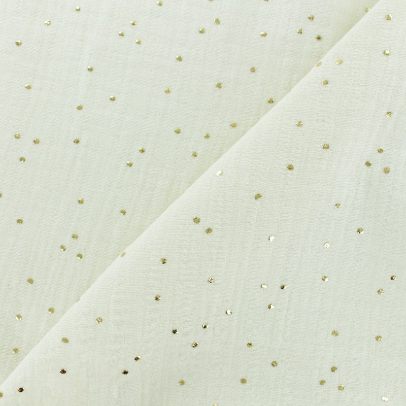 Ce tissu double gaze de coton écru à pois dorés est d'une extrême douceur. Elle sera parfaite pour faire des vêtements tels que des blouses ou pour confectionner la mythique petite robe noire.