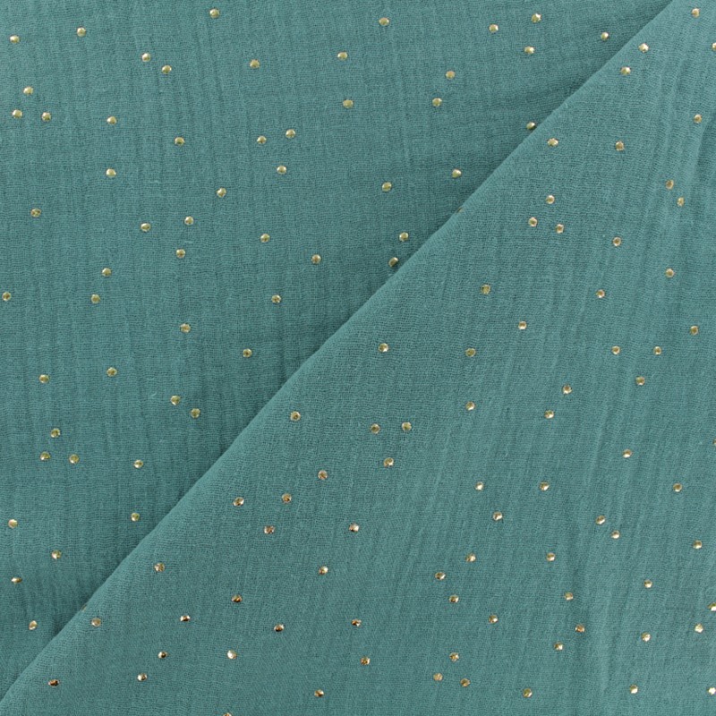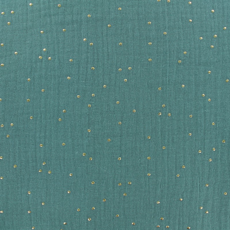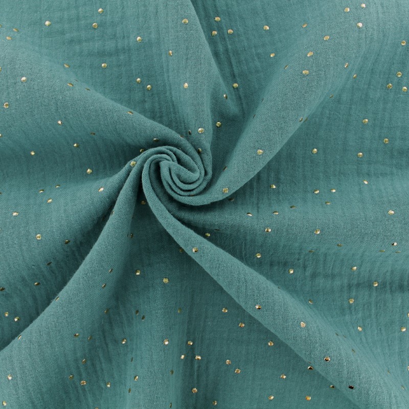 Ce tissu double gaze de coton eucalyptus à pois dorés est d'une extrême douceur. Elle sera parfaite pour faire des vêtements tels que des blouses ou pour confectionner la mythique petite robe noire.