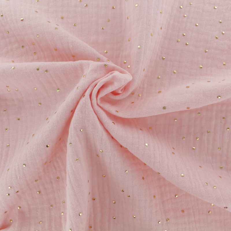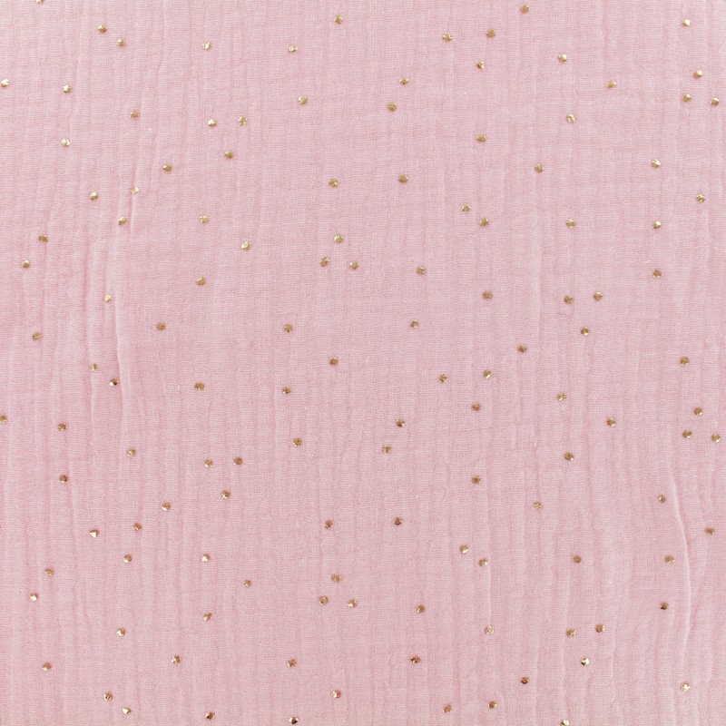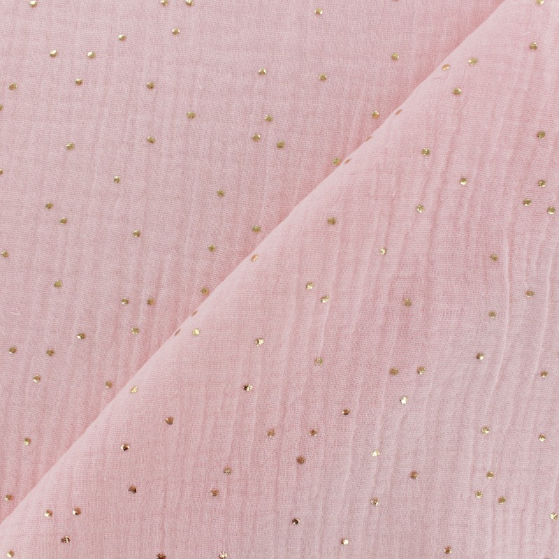Tissu double gaze de coton pois dorés et blush