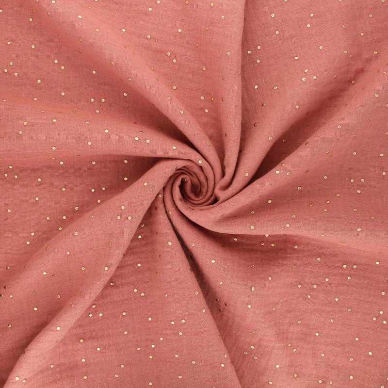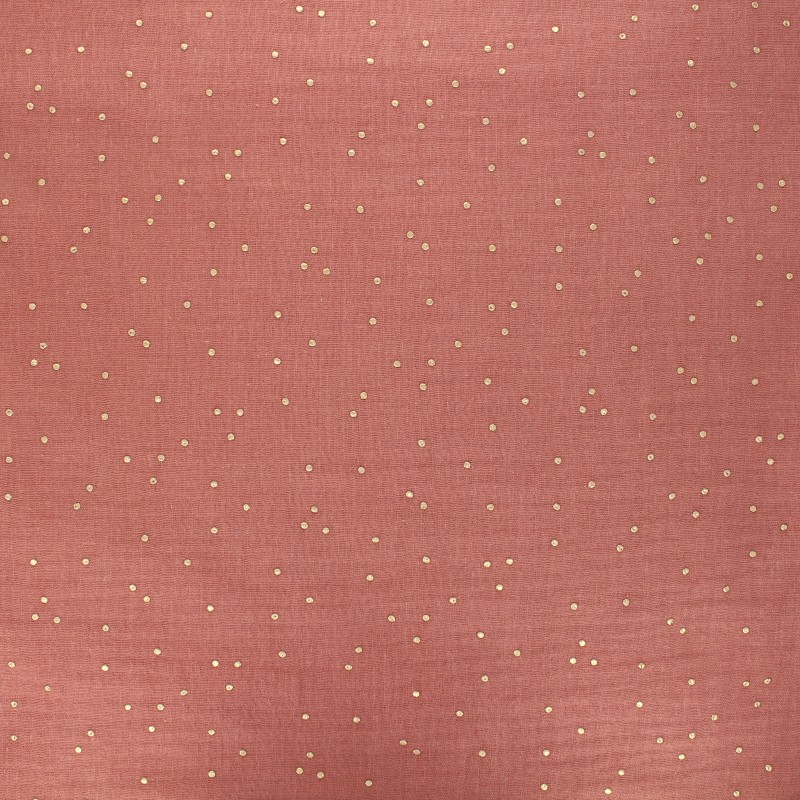 Ce tissu double gaze de coton marsala à pois dorés est d'une extrême douceur. Elle sera parfaite pour faire des vêtements tels que des blouses ou pour confectionner la mythique petite robe noire.
