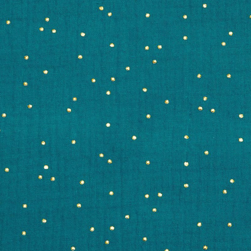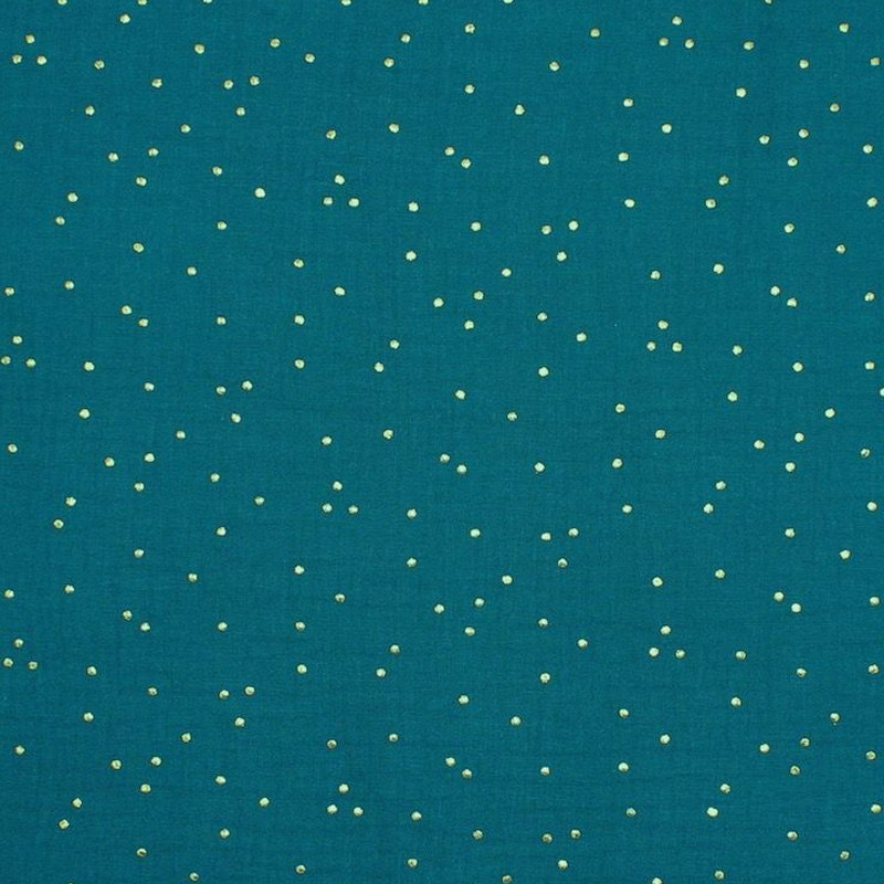 Ce tissu double gaze de coton paon à pois dorés est d'une extrême douceur. Elle sera parfaite pour faire des vêtements tels que des blouses ou pour confectionner la mythique petite robe noire.