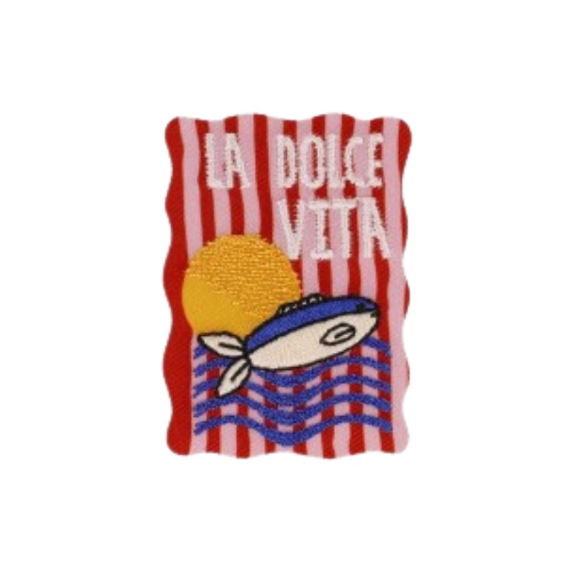 Customisez vos créations avec cet écusson La dolce vita sur un fond rayé. Idéal pour personnaliser un t-shirt, un jean, une trousse ou un sac à dos, il se fixe en un instant au fer à repasser.