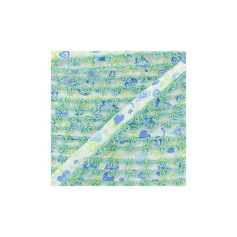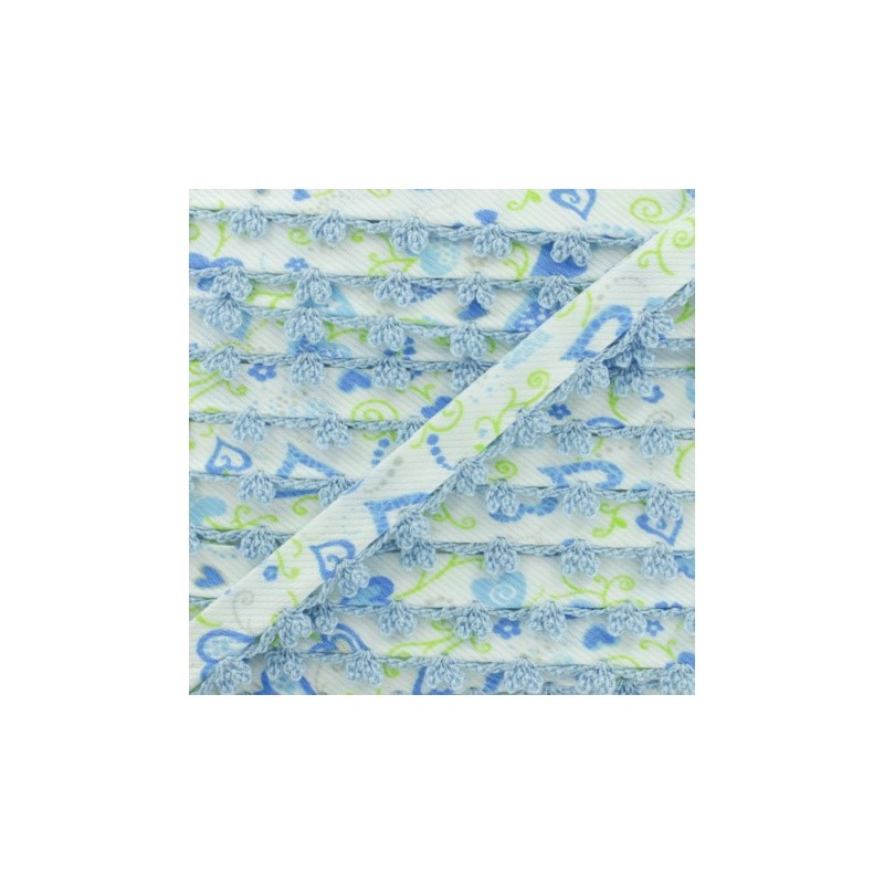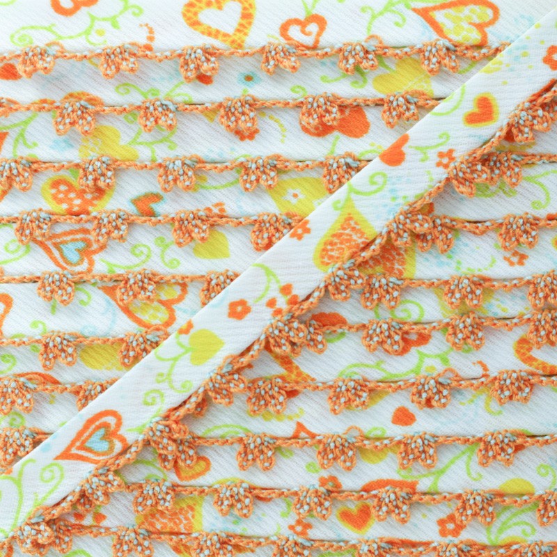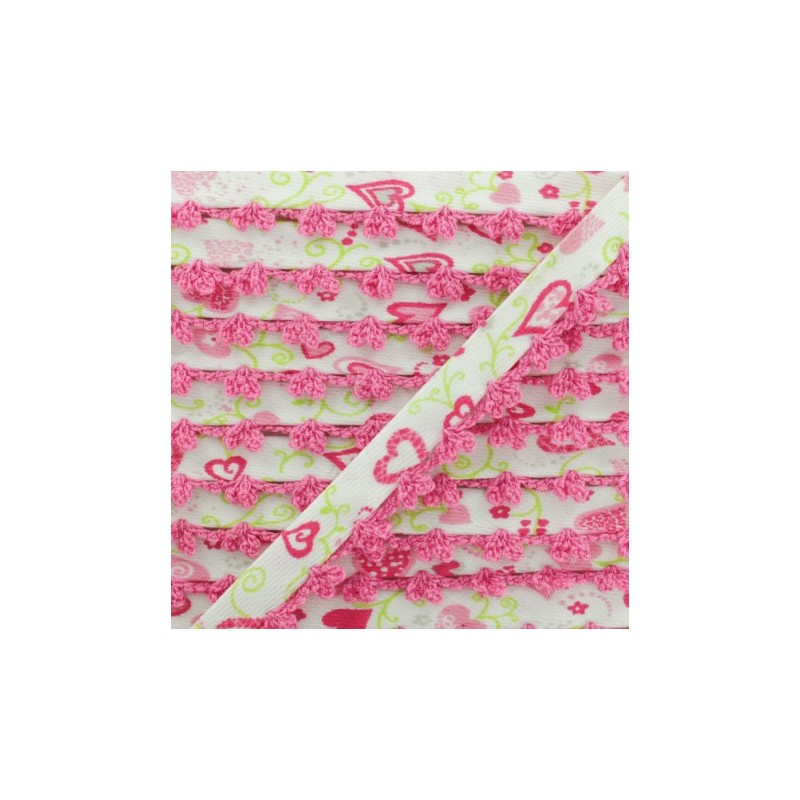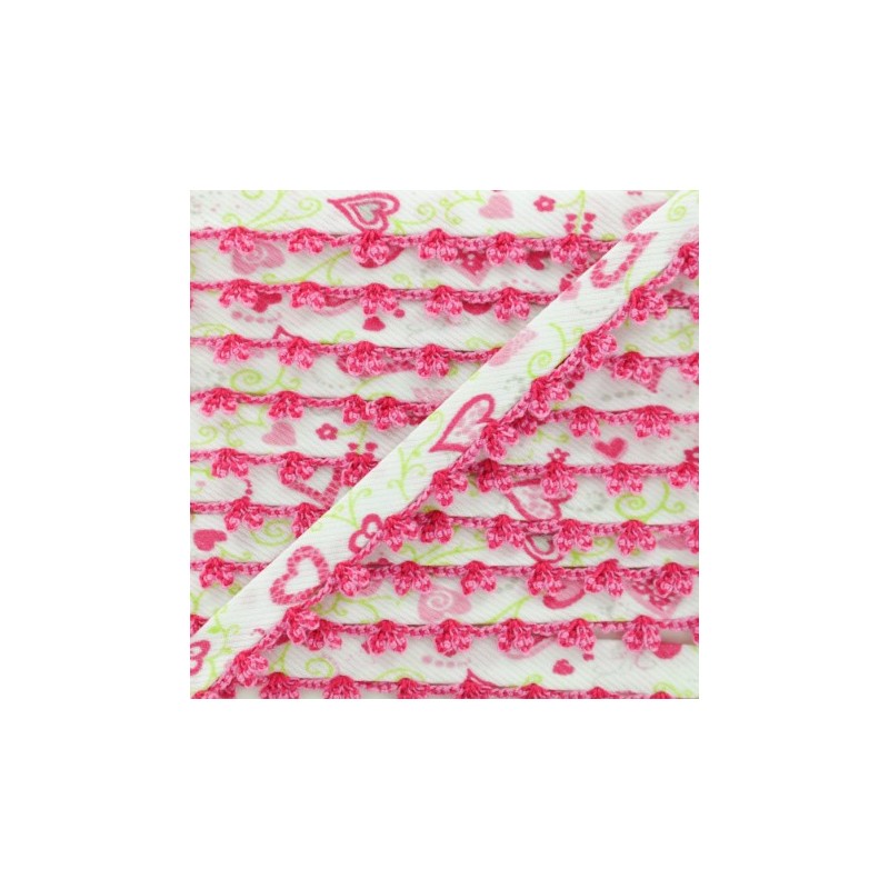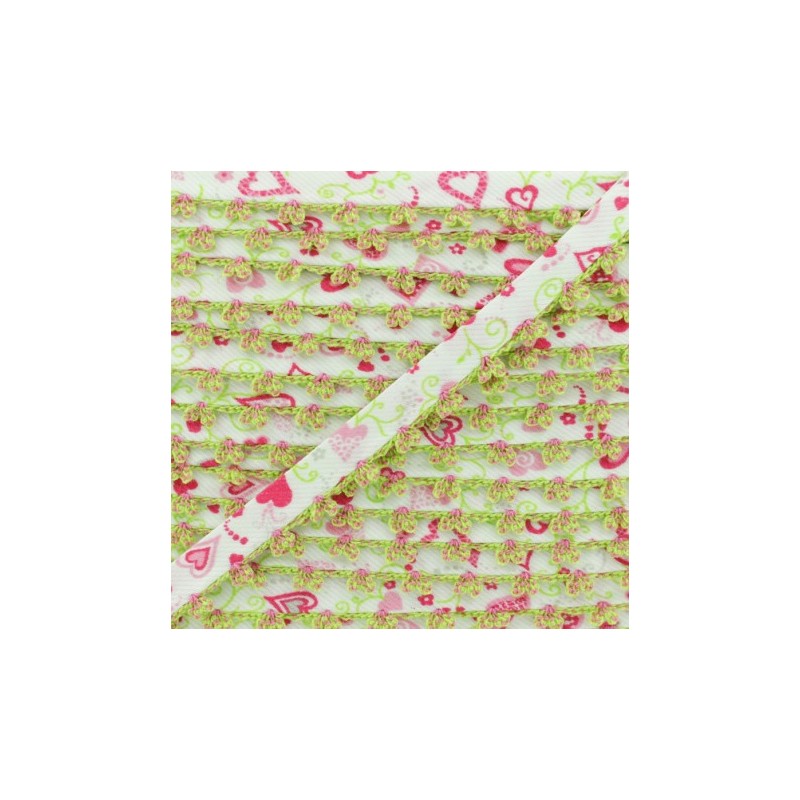 Biais replié 10 mm à bord picot bicolore. Ce joli biais en tissu sergé à motif coeur sera idéal pour coudre des vêtements et accessoires pour enfant. Appréciez la finesse du bord crocheté sur des emmanchures, un bas de jupe, un bavoir pour bébé, etc.