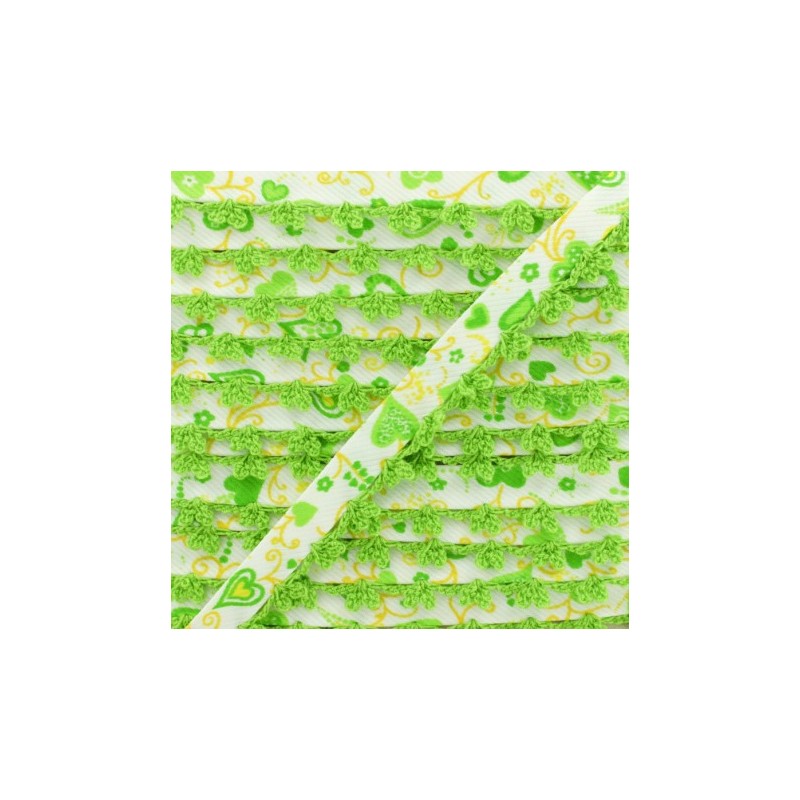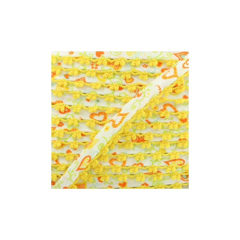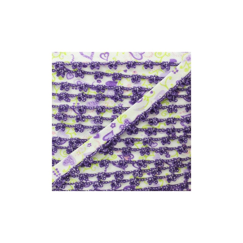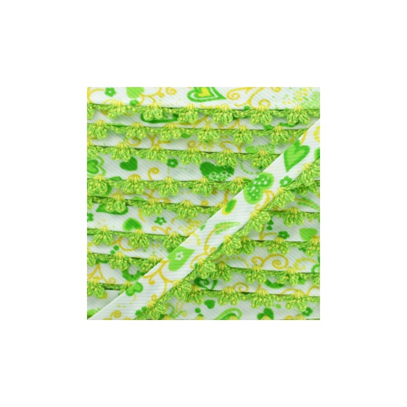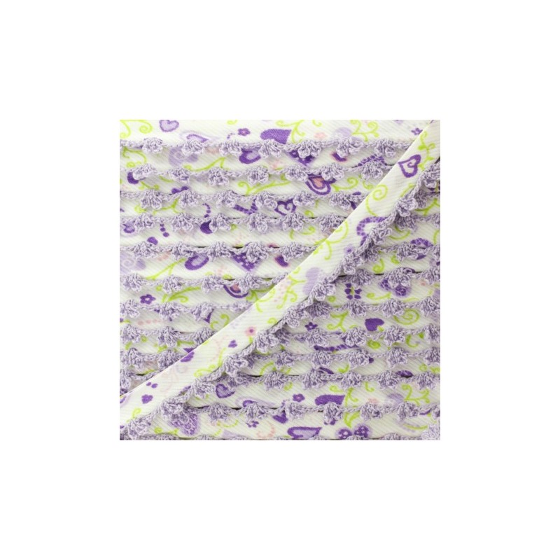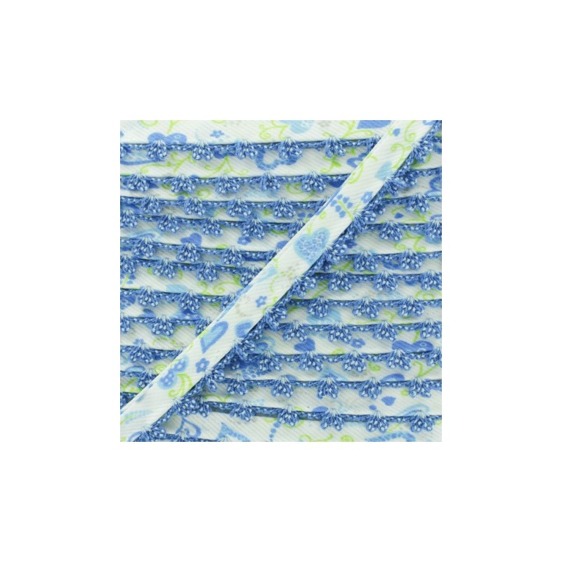 Biais replié 10 mm à bord picot bicolore. Ce joli biais en tissu sergé à motif coeur sera idéal pour coudre des vêtements et accessoires pour enfant. Appréciez la finesse du bord crocheté sur des emmanchures, un bas de jupe, un bavoir pour bébé, etc.