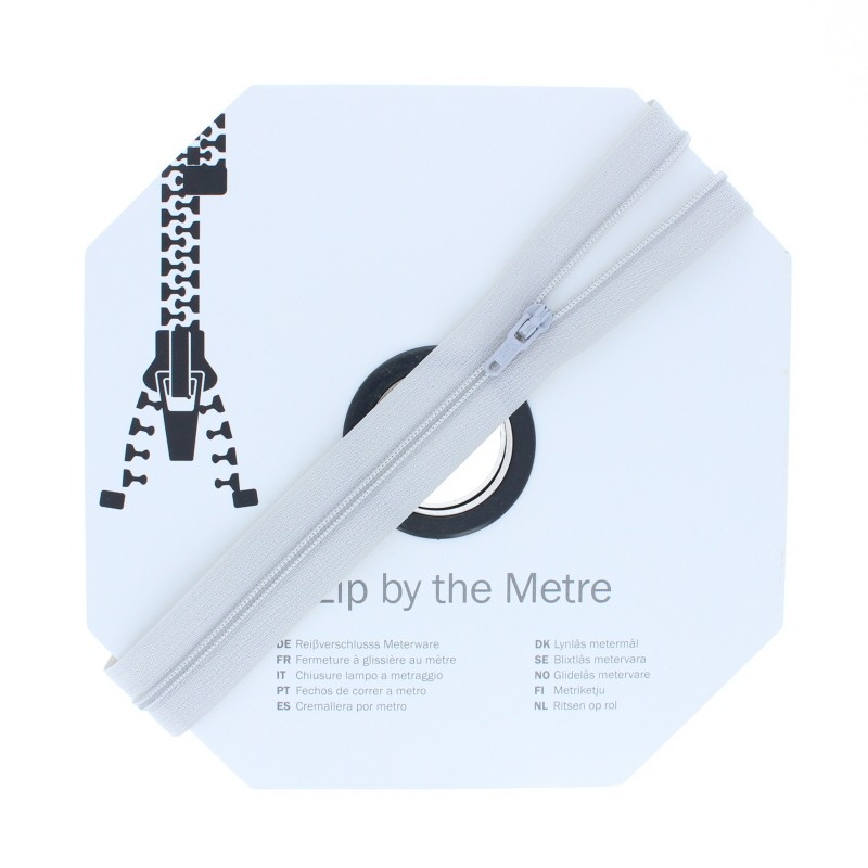 Fermeture à glissière gris clair avec curseurs intégrés. Cette fermeture à glissière de grande qualité est très flexible et s’adaptera facilement à tous les vêtements, chaussures, sacs et bagages. Le rouleau de 10 mètres présente 30 curseurs intégrés à la maille (soit 3 curseurs pré-intégrés pour 1 mètre). Produit STANDARD 100 by OEKO-TEX®.