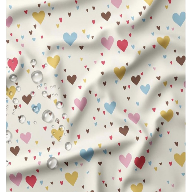 Un ciré de pluie pour la mi-saison ou un été pluvieux, ce tissu imperméable Tiamo sera parfait. Avec ses jolis motifs de cœurs colorés sur un fond écru, les petits et les grands vont l'adorer !