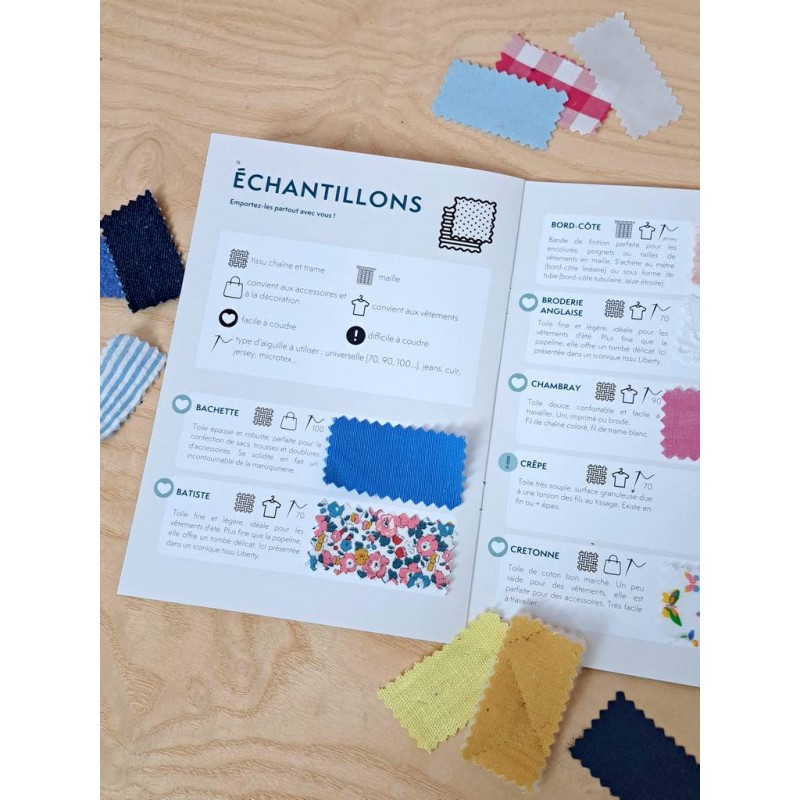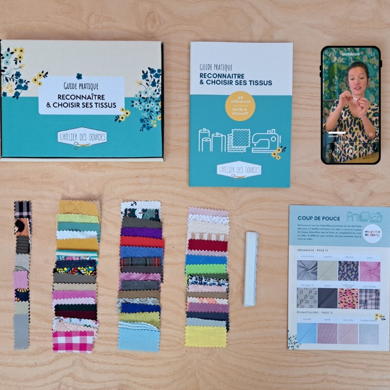 Découvrez le guide pratique crée par L'atelier des gourdes. Ce coffret complet est la bible des couturières : un livret technique de 27 pages, 1h43 de cours vidéo et 60 échantillons réels à toucher. Apprenez à dompter les grammages, armures et réglages machine.