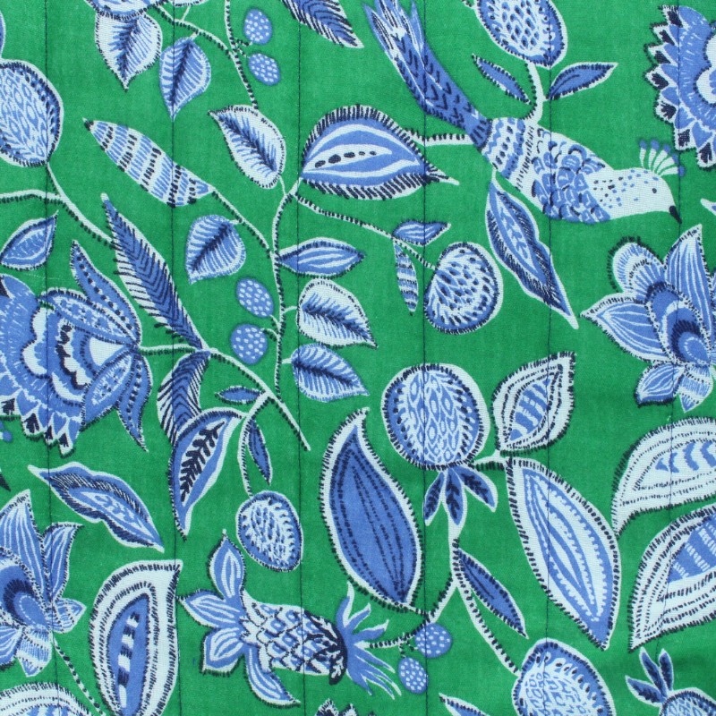 Optez pour la tendance tissu indien pour votre projet couture avec ce tissu en double gaze matelassée avec ses fleurs et ses oiseaux sur fond vert, idéal pour la couture de vêtements, accessoires.