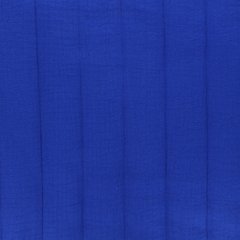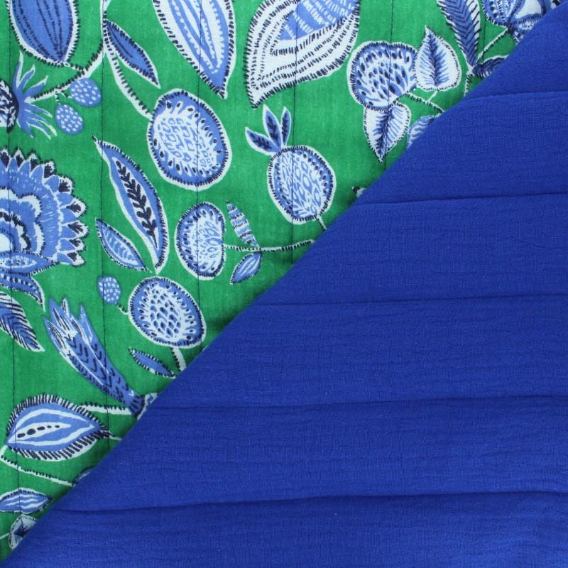 Ce tissu matelassé a une face en double gaze bleue unie et l'autre à motif fleuri.