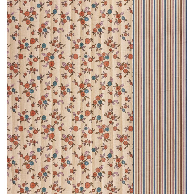 Craquez pour ce tissu matelassé réversible, avec d'un côté un tissu double gaze avec un motif fleuri sur fond rose et de l'autre côté un tissu seersucker rayé. Moelleux et facile à travailler, ce tissu est parfait pour un sac cabas, une veste, une trousse ou une couverture nomade.