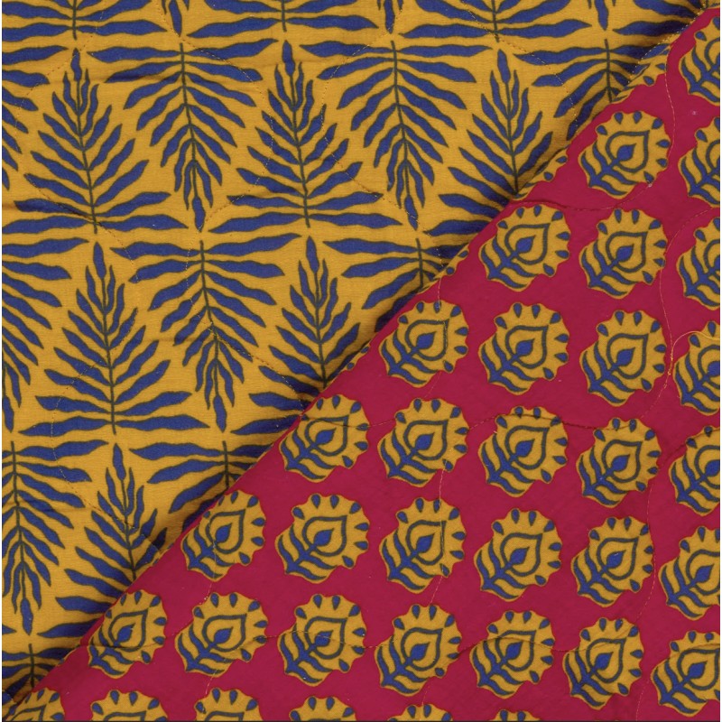 Découvrez Soli, notre tissu double gaze matelassé réversible aux motifs abstraits. Moelleux et prêt à coudre, il est le chouchou pour réaliser une veste sans manches ou un sac cabas.