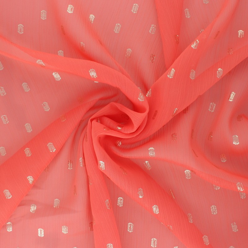 Confectionnez de superbes tenues de cérémonies ou du quotidien avec ce joli tissu Happy en mousseline légère et fluide. Délicat et élégant, ce tissu mousseline avec de jolis pois dorés ovales sur un fond corail amènera finesse et légèreté à vos projets de couture. Ce tissu est transparent, pensez à le doubler pour plus d'opacité.