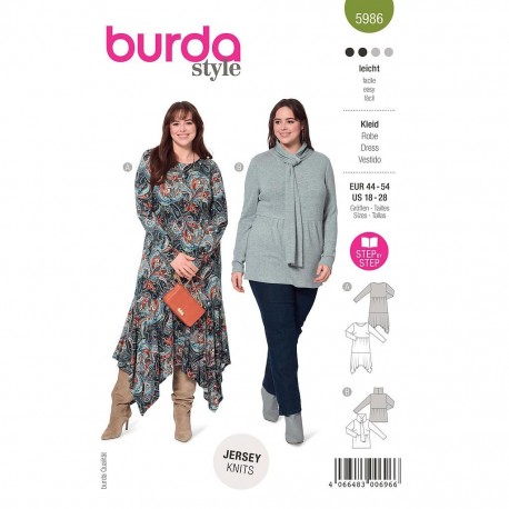 Découvrez la jolie collection de patrons de couture de la marque Burda spécial jersey ! Craquez pour le modèle n°5986 grande taille de cette robe à manches longues qui se décline en tunique. À coudre en tissus jersey uniquement, elle sera confortable et fluide. Ce patron conviendra aux tailles 46 à 56 !
