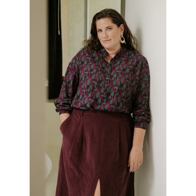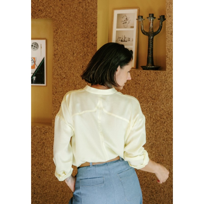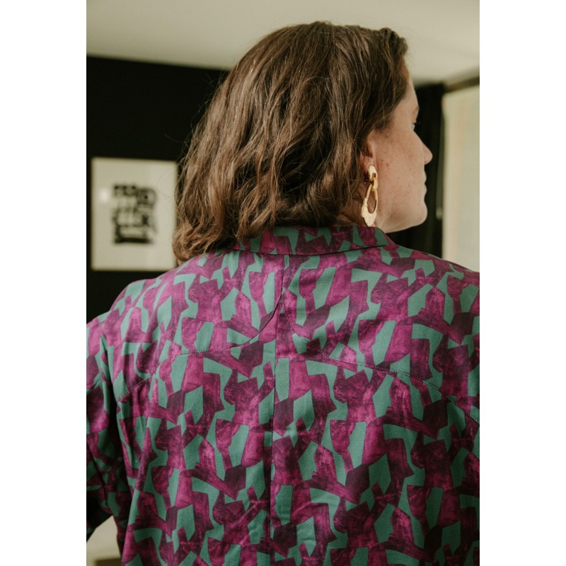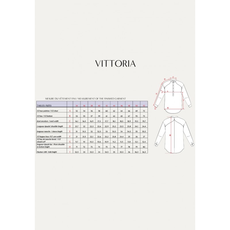 Le patron de couture Vittoria revisite la liquette masculine avec une élégance moderne. Sa coupe droite et ample, sa patte polo, son petit col et ses empiècements signature en font une pièce unique, à glisser facilement dans une jupe ou un pantalon pour un look naturellement chic.