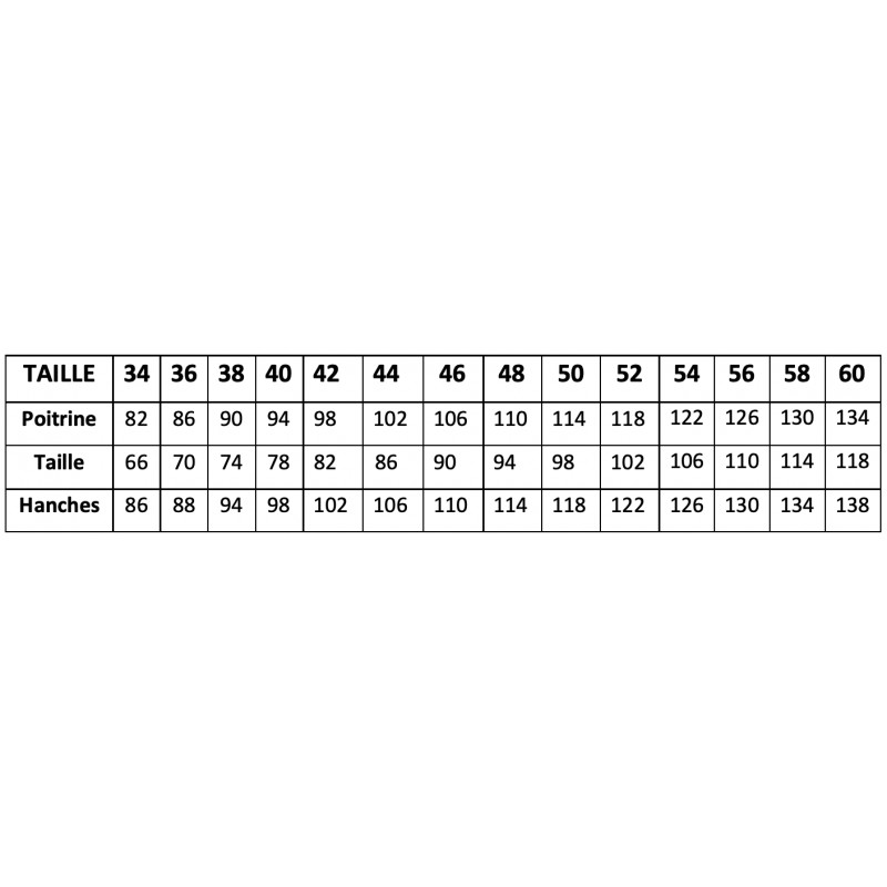 | Taille | 34, 36, 38, 40, 42, 44, 46, 48, 50, 52, 54, 56, 58, 60 |