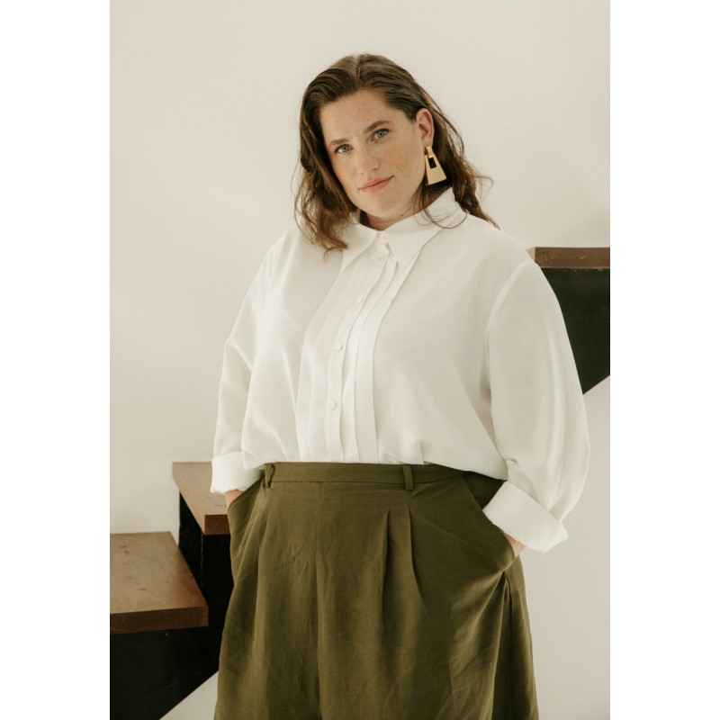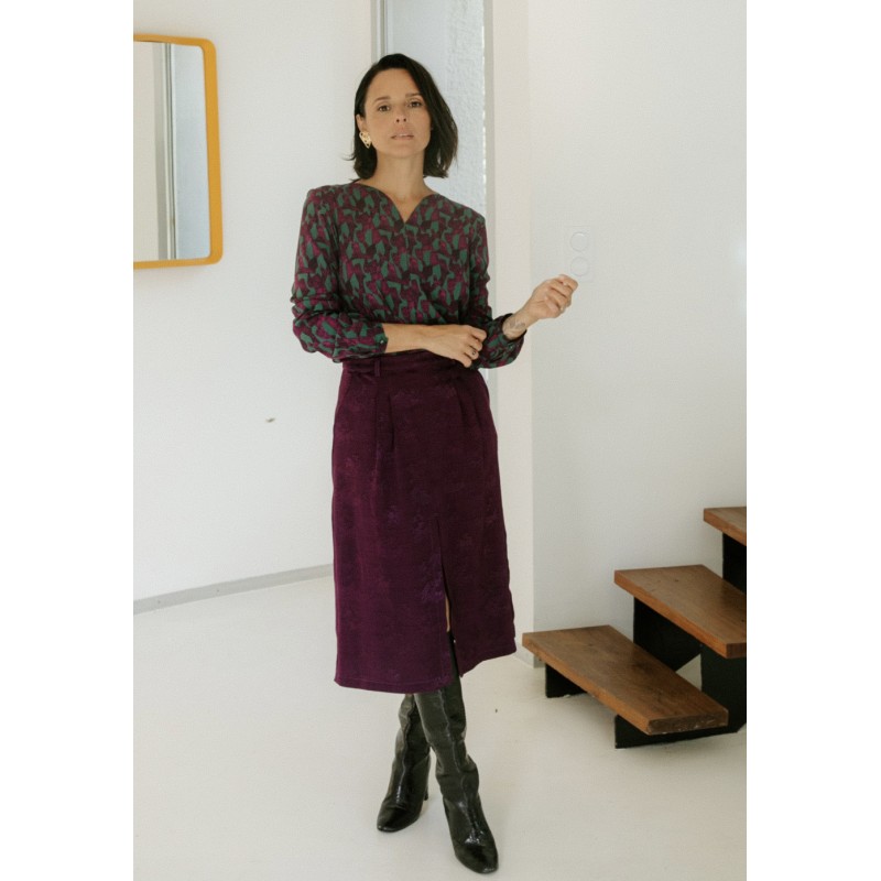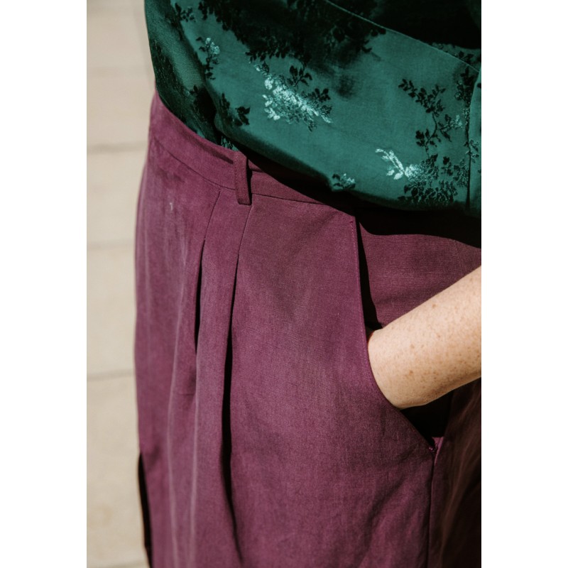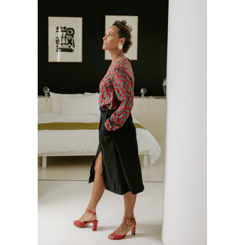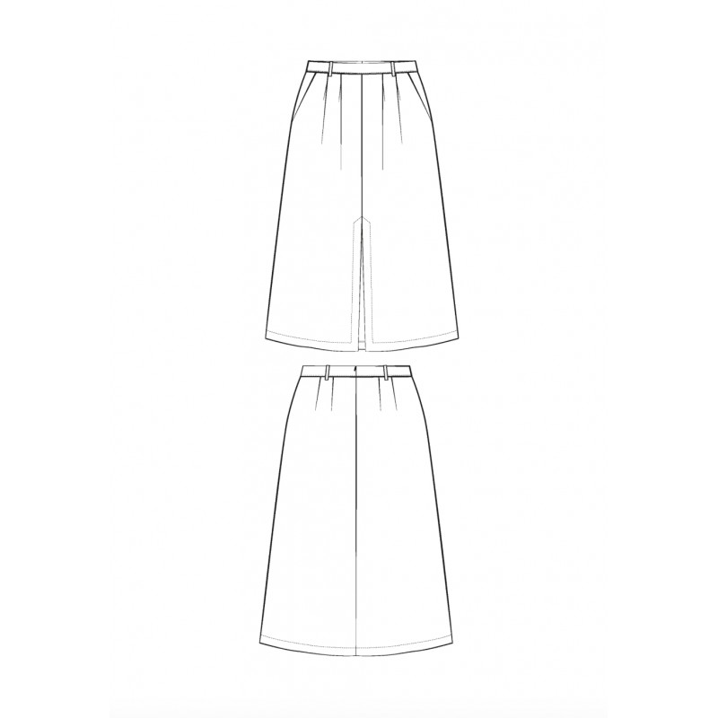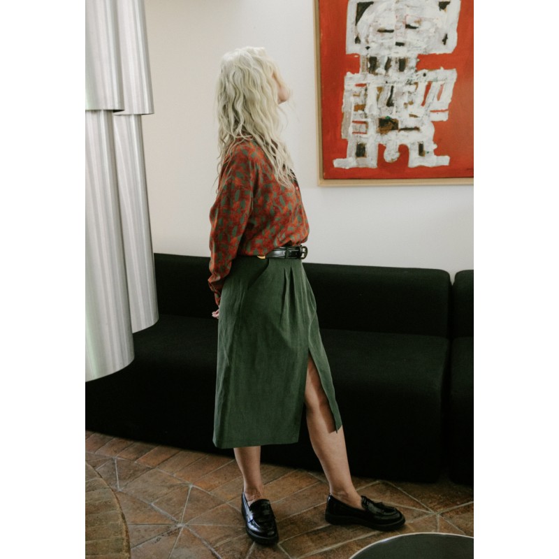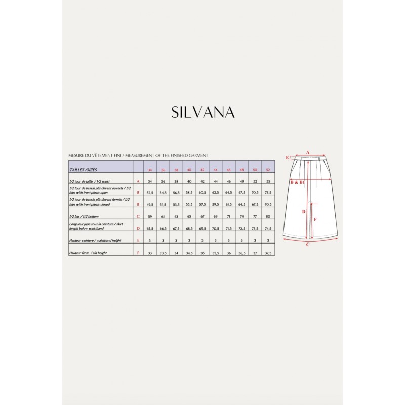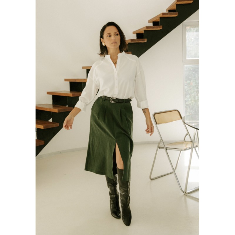 La jupe Silvana réinterprète de manière féminine le pantalon de tailleur : coupe légèrement évasée et longueur midi intemporelle, haute fente frontale pour l’aisance et l’allure, poches italiennes et ceinture fine avec des passants pour une élégance assumée. Le dos est fermé par un zip invisible et appuyé par des pinces pour un tombé parfait.