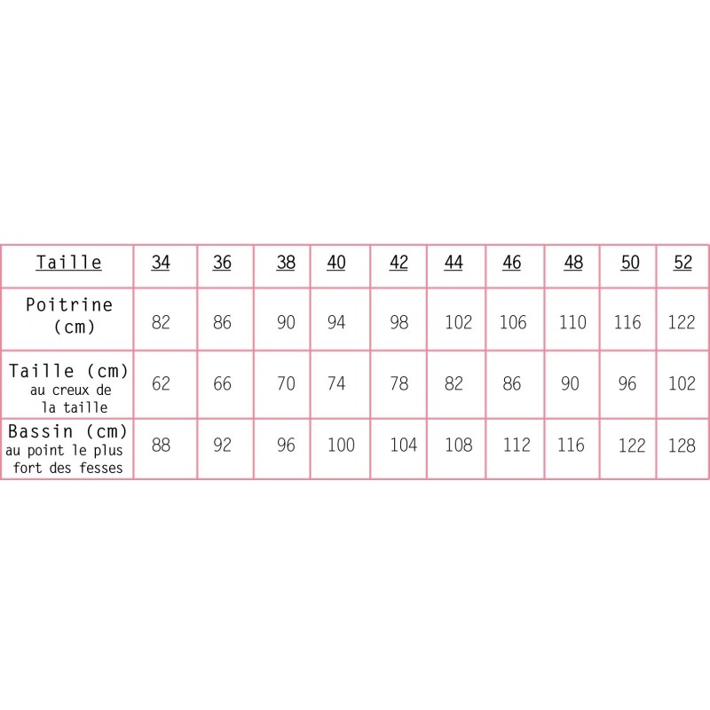 | Taille | 34, 36, 38, 40, 42, 44, 46, 48, 50, 52 |