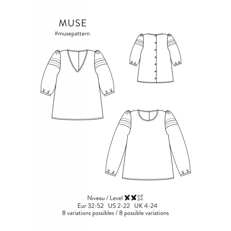 La blouse Muse d'Atelier Scammit charme par ses manches au volume spectaculaire, rythmées de fronces et de plis plats ou creux. Féminine et ingénieuse, elle offre 8 variations pour jouer avec les encolures (ronde ou V) et une délicate patte de boutonnage au dos. Un modèle aux détails raffinés qui permet de créer une pièce unique, à l'allure romantique et structurée.