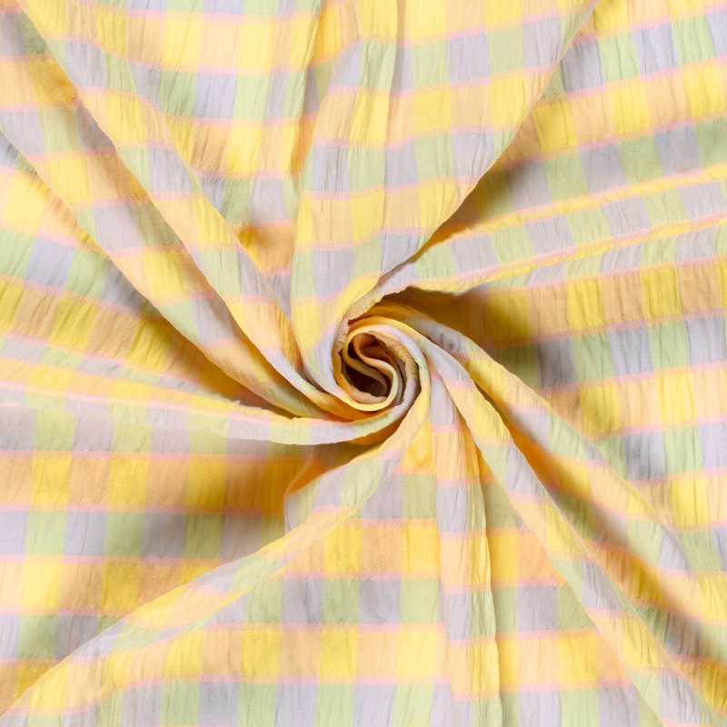 Cap sur les tenues estivales et douces avec ce tissu coton Guada. Craquez pour ce seersucker à carreaux colorés idéal pour la confection de robes, chemisiers et tops légers.