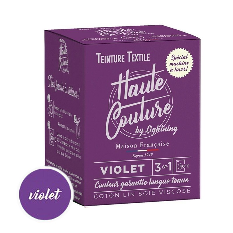 Découvrez la teinture textile violet, de marque Haute Couture, pour teindre vos tissus en coton, lin, soie et viscose. Elle est garantie longue tenue et donnera une seconde vie à vos vêtements et accessoires ! Efficace et facile à utiliser, cette teinture 3 en 1 s'utilise en machine à laver.