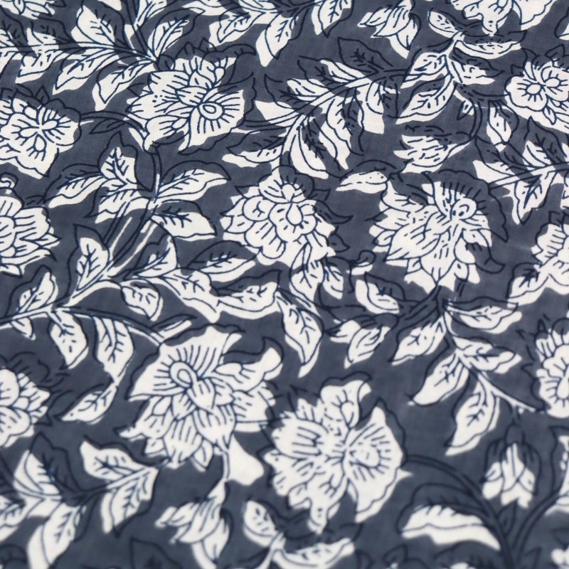 Découvrez ce tissu indien Pune en voile de coton gris. Fabriqué en Inde au motif fleuri imprimé de façon traditionnelle avec des tampons en bois, ce voile de coton 100 % coton est idéal pour confectionner des vêtements légers et aériens : tops, chemises, robes, mais également des foulards ou encore des coussins et des rideaux.