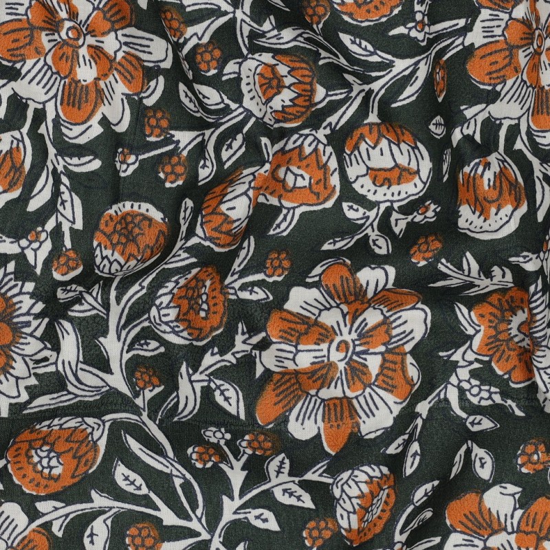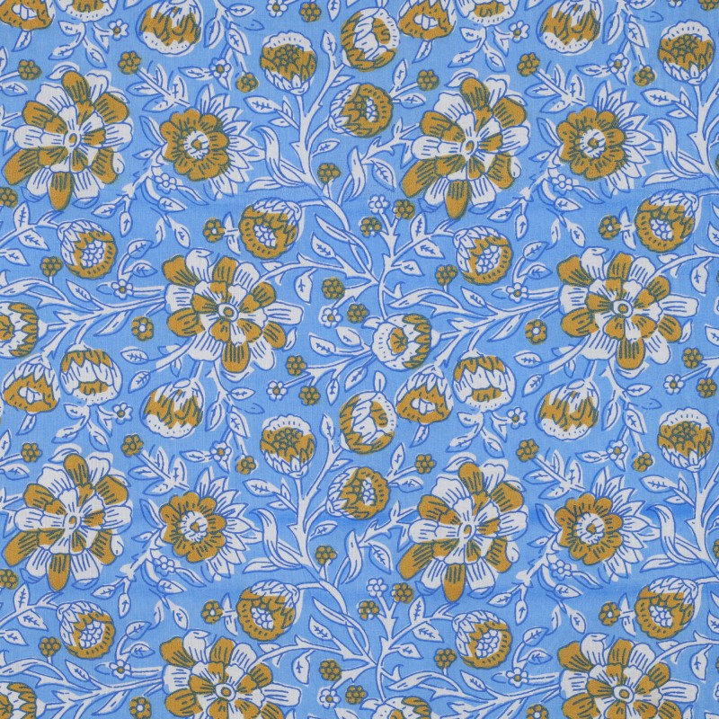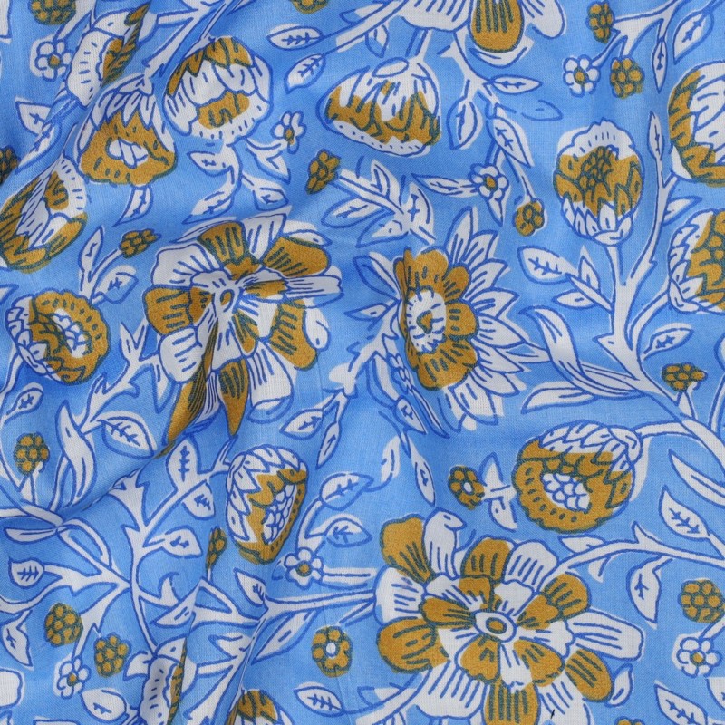 Découvrez ce tissu indien Kerala fleuri en voile de coton. Fabriqué en Inde et imprimé de façon traditionnelle avec des tampons en bois, ce voile de coton 100 % coton est idéal pour confectionner des vêtements légers et aériens : tops, chemises, robes, mais également des foulards ou encore des coussins et des rideaux.