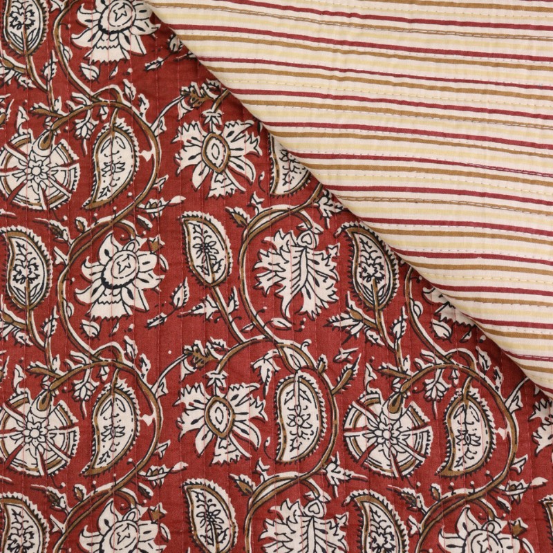 Craquez pour ce tissu matelassé réversible Raghura, un tissu indien imprimé de façon traditionnelle orné d’un motif fleuri. Parfait pour la confection de sacs, pochettes, bananes, vestes matelassées ou accessoires faits main, il ajoutera une touche originale à tous vos projets couture.