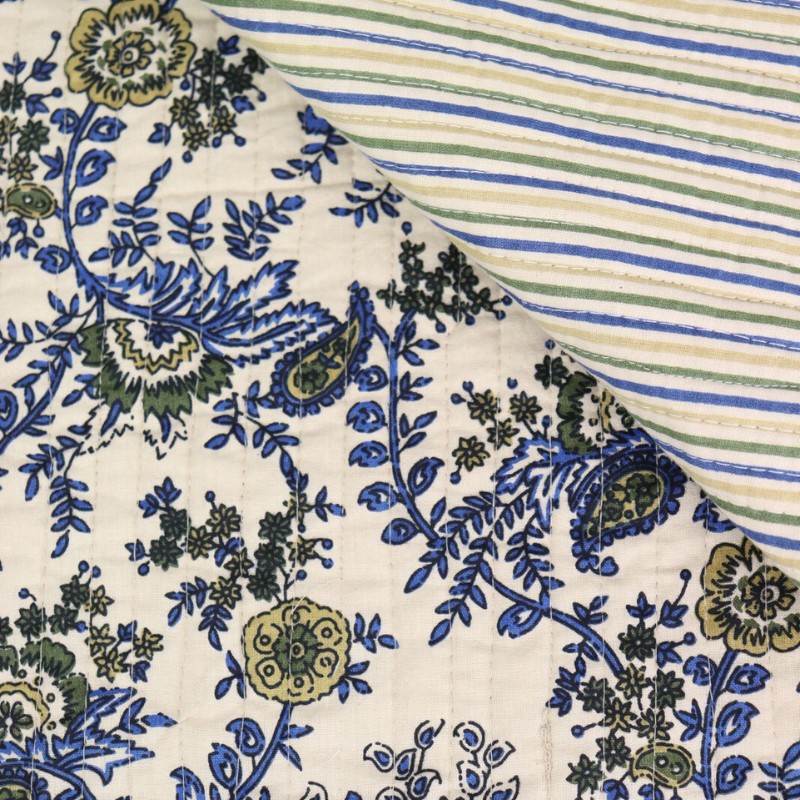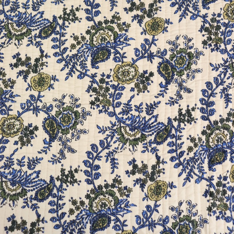 Craquez pour ce tissu matelassé réversible Majuli, un tissu indien imprimé de façon traditionnelle orné d’un motif fleuri. Parfait pour la confection de sacs, pochettes, bananes, vestes matelassées ou accessoires faits main, il ajoutera une touche originale à tous vos projets couture.