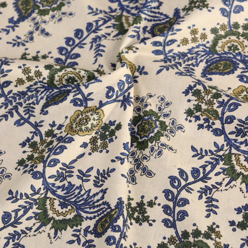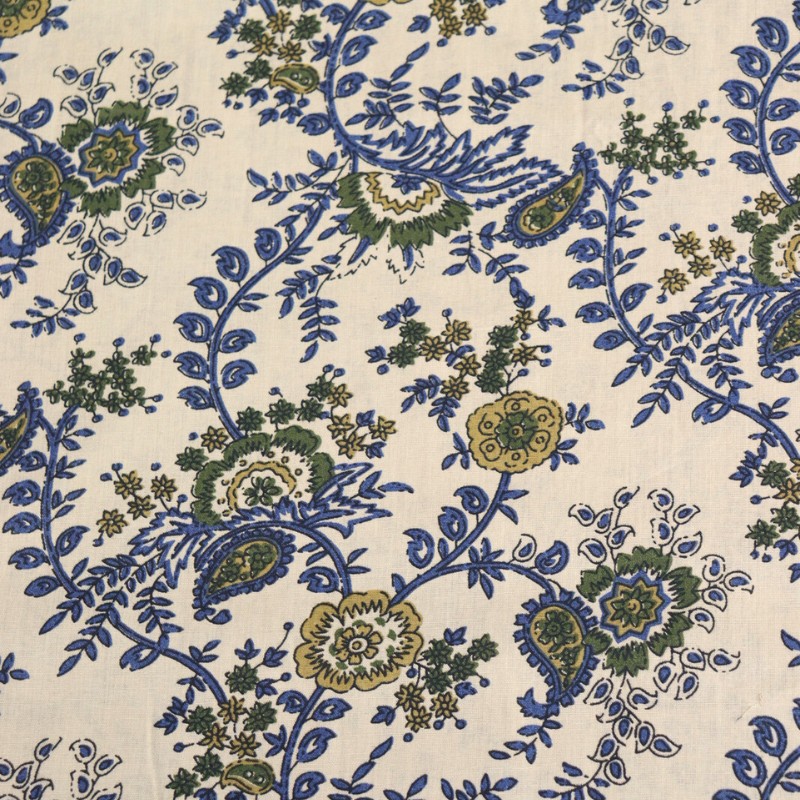 Découvrez ce tissu indien Majuli en voile de coton écru. Fabriqué en Inde au motif fleuri imprimé de façon traditionnelle avec des tampons en bois, ce voile de coton 100 % coton est idéal pour confectionner des vêtements légers et aériens : tops, chemises, robes, mais également des foulards ou encore des coussins et des rideaux.