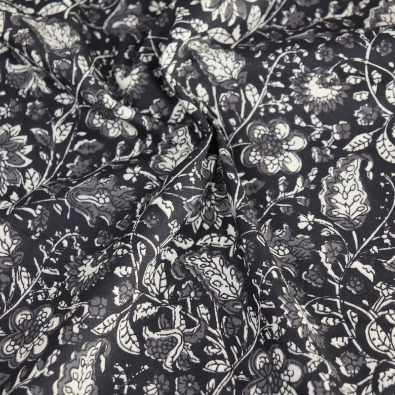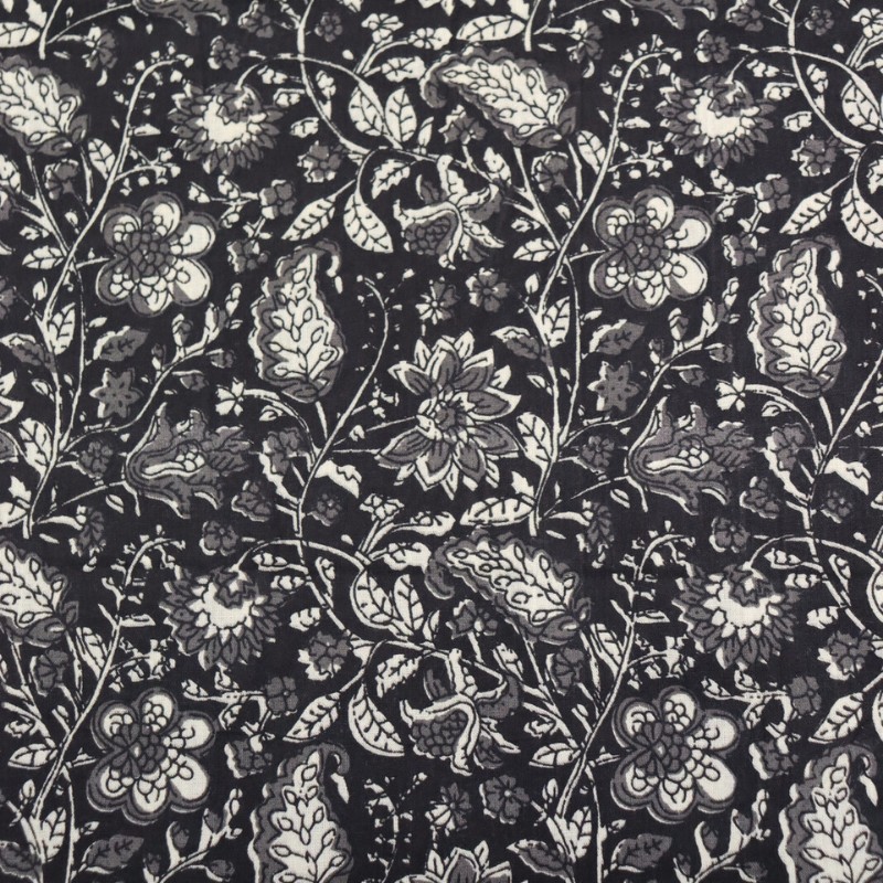 Découvrez ce tissu indien Mattur en voile de coton noir. Fabriqué en Inde au motif fleuri imprimé de façon traditionnelle avec des tampons en bois, ce voile de coton 100 % coton est idéal pour confectionner des vêtements légers et aériens : tops, chemises, robes, mais également des foulards ou encore des coussins et des rideaux.
