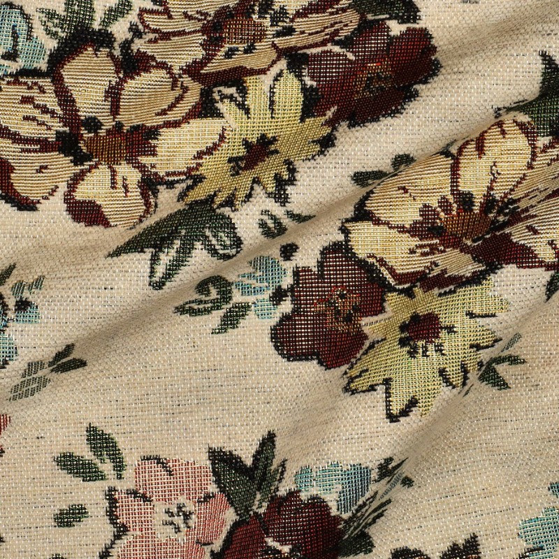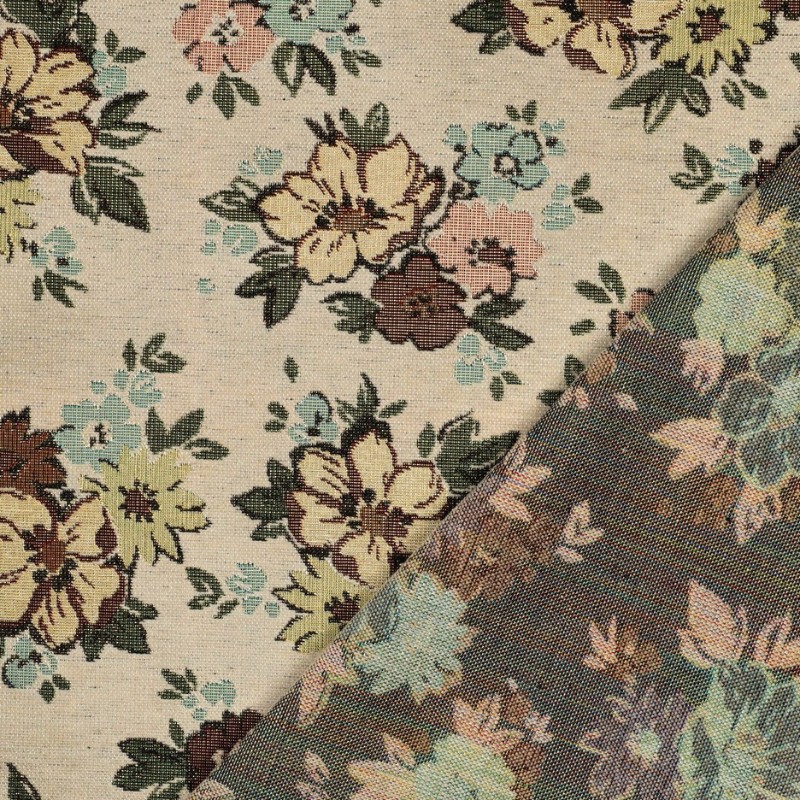 Découvrez le tissu jacquard Floris, un tissu aux grosses fleurs colorées orné de fils lurex doré, sur un fond beige aspect velours. Il est parfait pour coudre des coussins, rideaux, une veste structurée ou bien un sac.