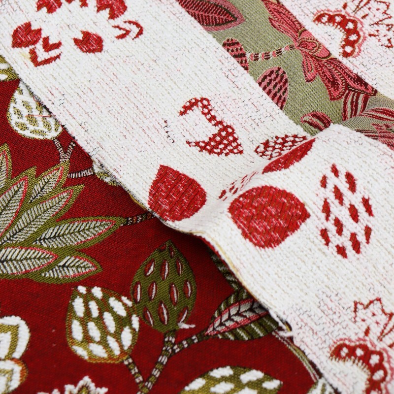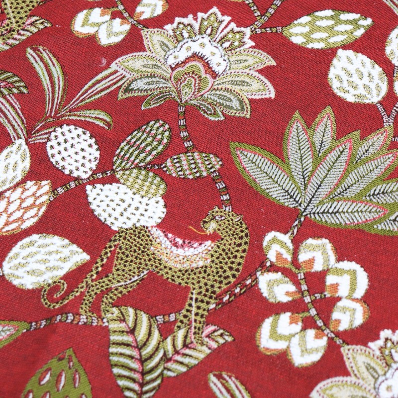Craquez pour ce tissu jacquard Soliman, fabriqué en France et son motif de panthères et végétations luxuriantes en relief sur un fond rouge. Ce tissu jacquard est de très belle qualité. Il est idéal pour la confection de fauteuils, poufs, coussins, rideaux, mais aussi vestes, jupes et cabas !