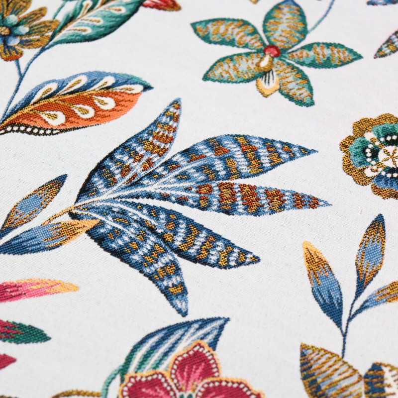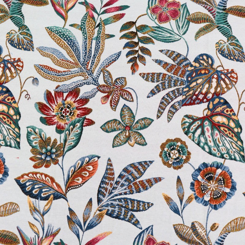 Craquez pour ce tissu jacquard Neroli, fabriqué en France et son motif de végétation et fleurs colorées sur un fond blanc. Ce tissu jacquard est de très belle qualité. Il est idéal pour la confection de fauteuils, poufs, coussins, rideaux, mais aussi vestes, jupes et cabas !