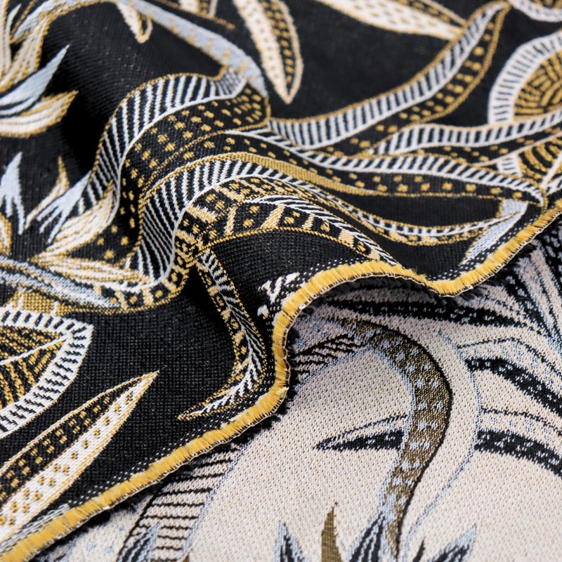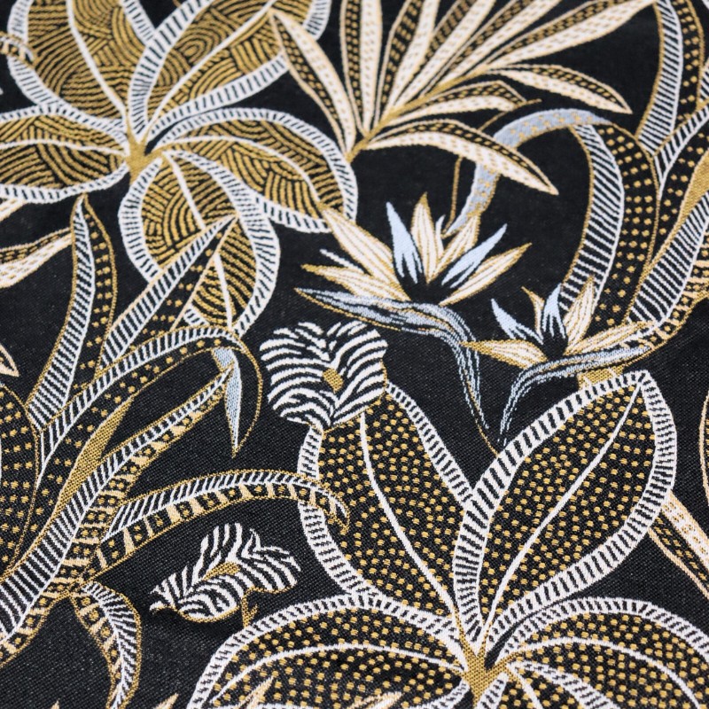 Craquez pour ce tissu jacquard Moranto, fabriqué en France et son motif de végétation sur un fond noir. Ce tissu jacquard est de très belle qualité. Il est idéal pour la confection de fauteuils, poufs, coussins, rideaux, mais aussi vestes, jupes et cabas !
