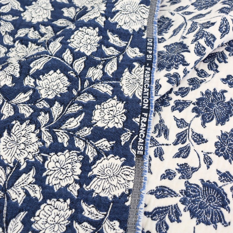 Craquez pour ce tissu jacquard Deepsi, fabriqué en France et son motif fleuri inspiration indienne. Ce tissu jacquard est de très belle qualité, avec un léger aspect matelassé. Il est idéal pour la confection de fauteuils, poufs, coussins, rideaux, mais aussi vestes et cabas !