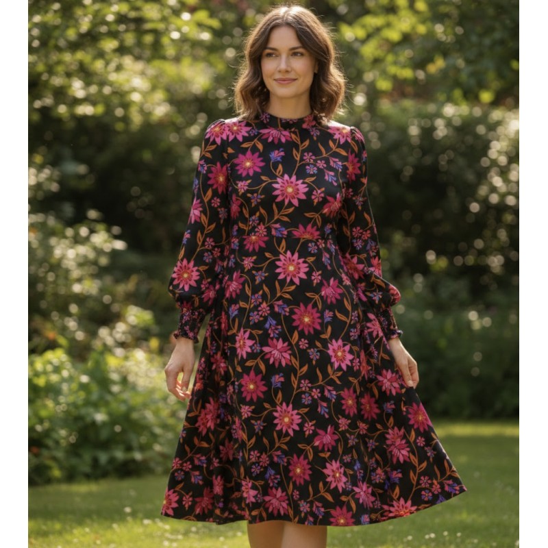 Découvrez le voile de coton Bohème de Pommé Fabrics. Son imprimé floral vibrant, mêlant fuchsia éclatant, violet et touches ocre sur un fond noir profond, offre un style à la fois audacieux et raffiné. Ce tissu 100 % coton léger et agréable au toucher, conviendra parfaitement à la confection d’accessoires, de chemises, de robes ou de combinaisons.